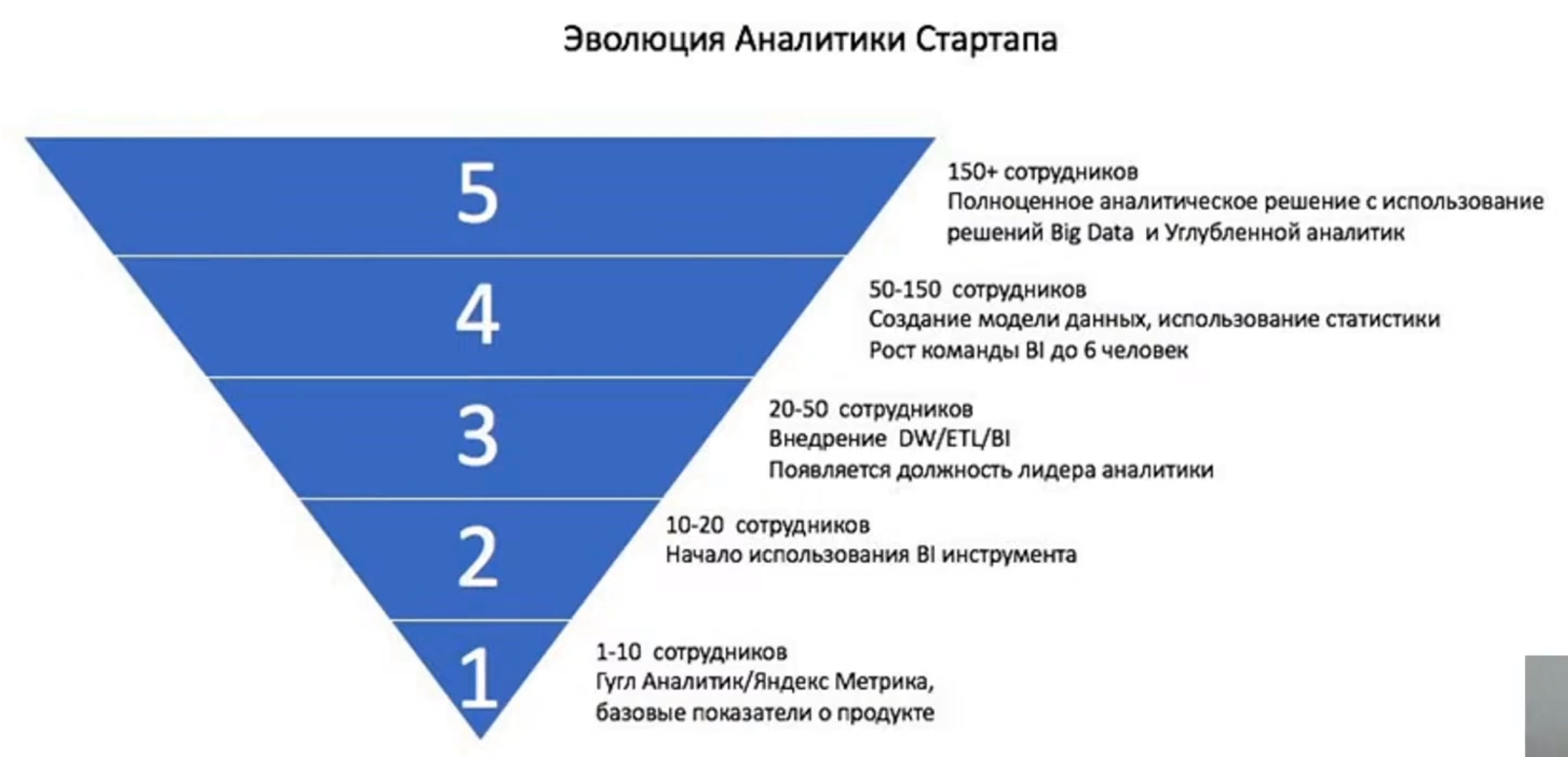 Повторюсь, 90% проектов не требуют ничего, кроме счетчиков аналитики и простых визуализаций. Можно нарисовать такую градацию необходимости аналитических инструментов: